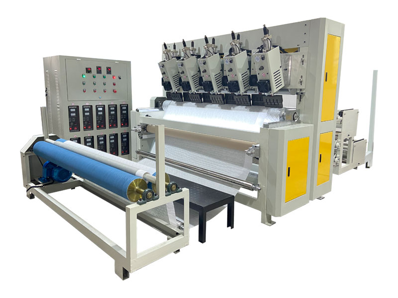 整機(jī)由壓花復(fù)合主機(jī)、超聲波控制柜、成品復(fù)卷機(jī)、存放織物支架組成。